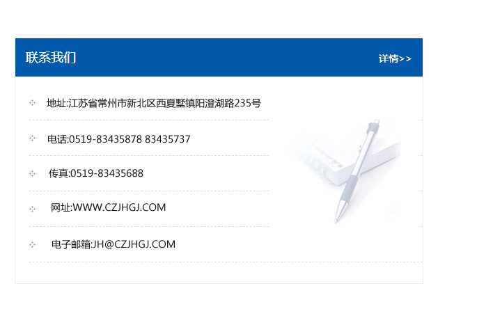 傳真:0519-83435688    郵編:213135    網址:WWW.czjhgj_com.wopingit.com    電子郵箱:JH@czjhgj_com.wopingit.com
